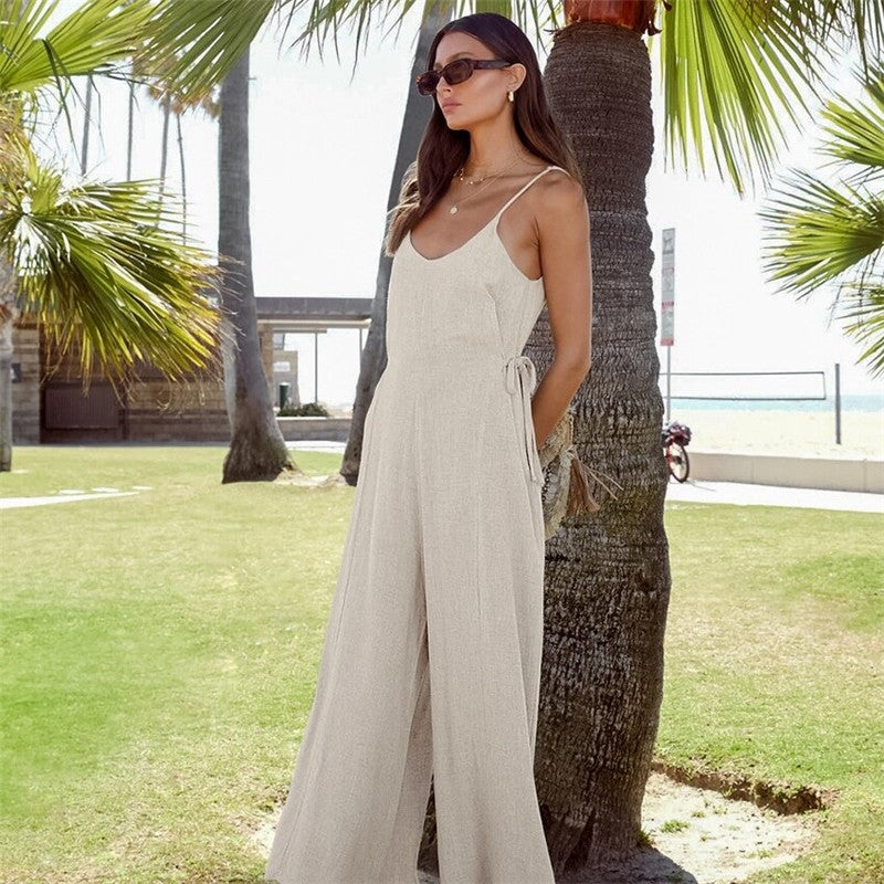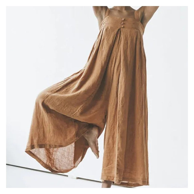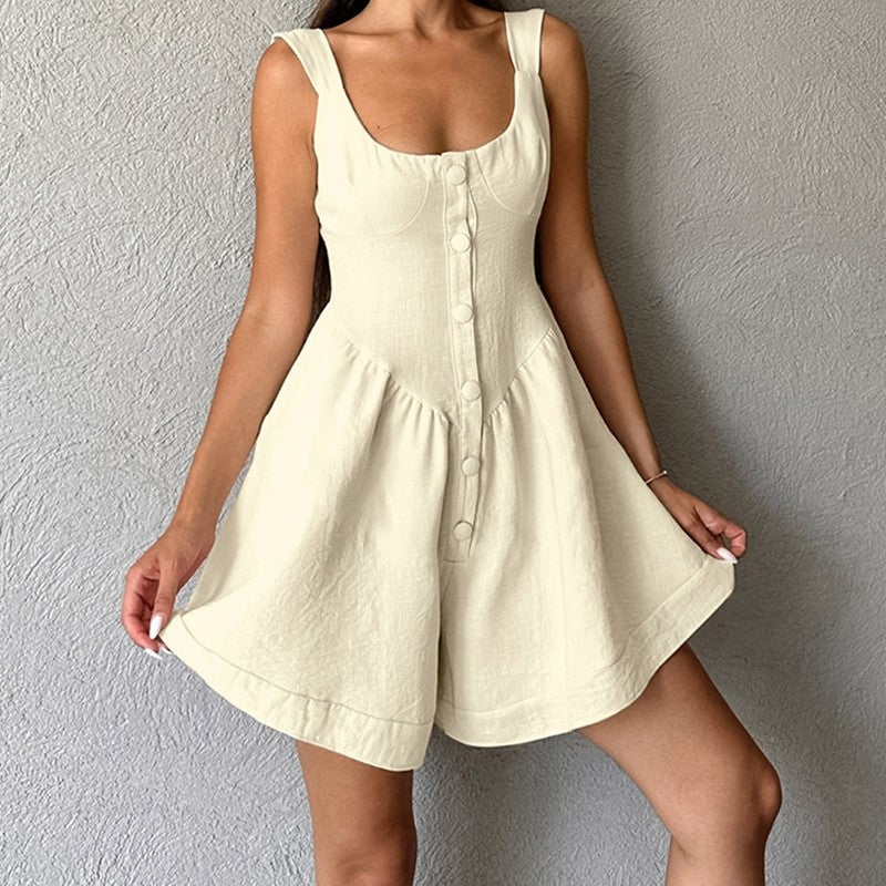 Sleeveless U-Neck Wide Leg Ramie Cotton Romper in Solid Color