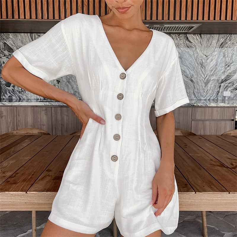 Material:Ramie CottonStyle:Classic,Wide Leg,Three-Quarter PantsFeature:Buttoned,Washable,Pockets,Solid ColorNeckline:V-neckOccasion:Going out,Casual,Original Creation,Stylish SelectionSeasons:SummerType:RompersSleeve Length:SleevelessSize S (inch) : Bust= 34.71 ;...