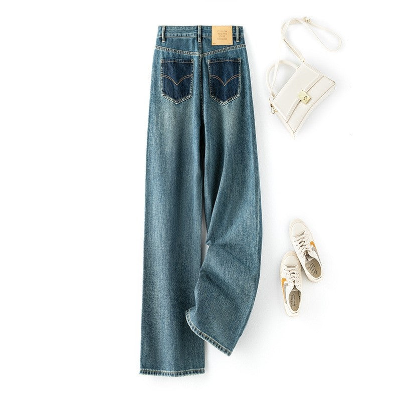Patchwork Wide Leg Workwear Denim Jeans with Pockets