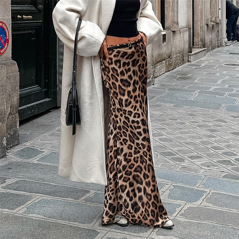 Leopard Print High-Waisted Zipper Fishtail Satin Maxi Skirt