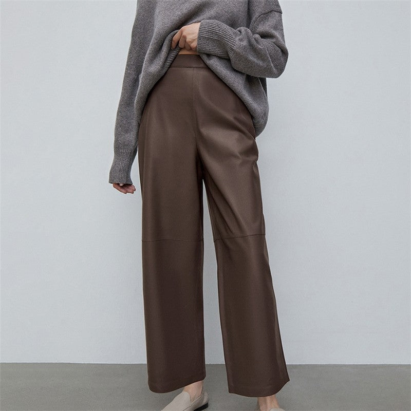 Matte Brown Velveteen High-Waisted Straight-Leg Leather Pants