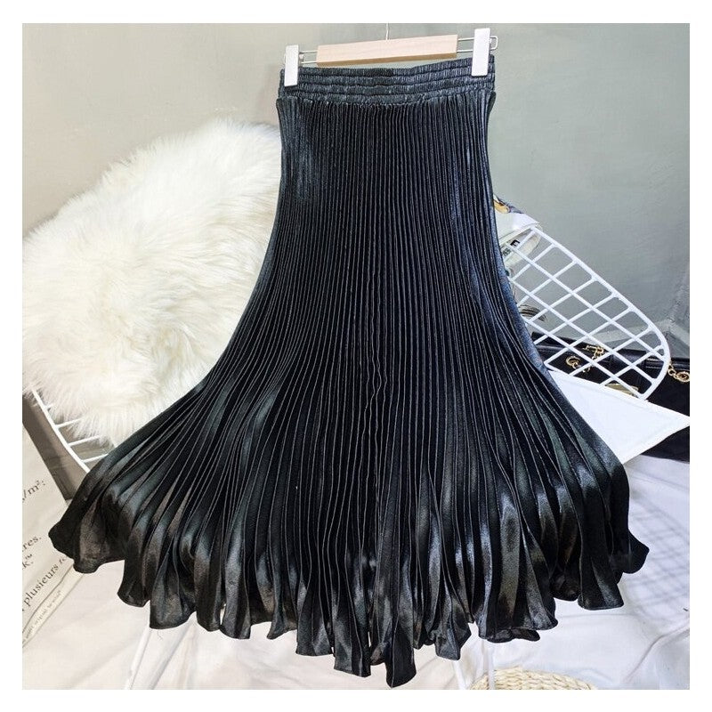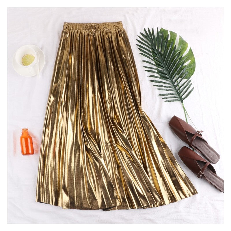 Metallic Color Reflective Fabric Mid-Length Pleated Skirt