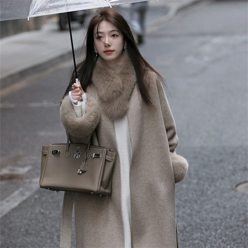 V-Neck Mid-Length Fox Fur Cuffs Double-Faced Cashmere Coat