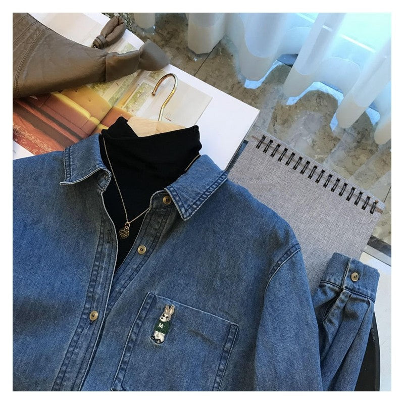 Loose Fit Embroidered Denim Shirt With Single Pocket