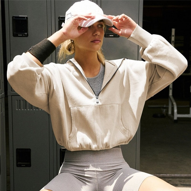 Long Sleeves Loose Pockets Solid Color Split-Joint Zipper Stand Collar Sweatshirt Tops