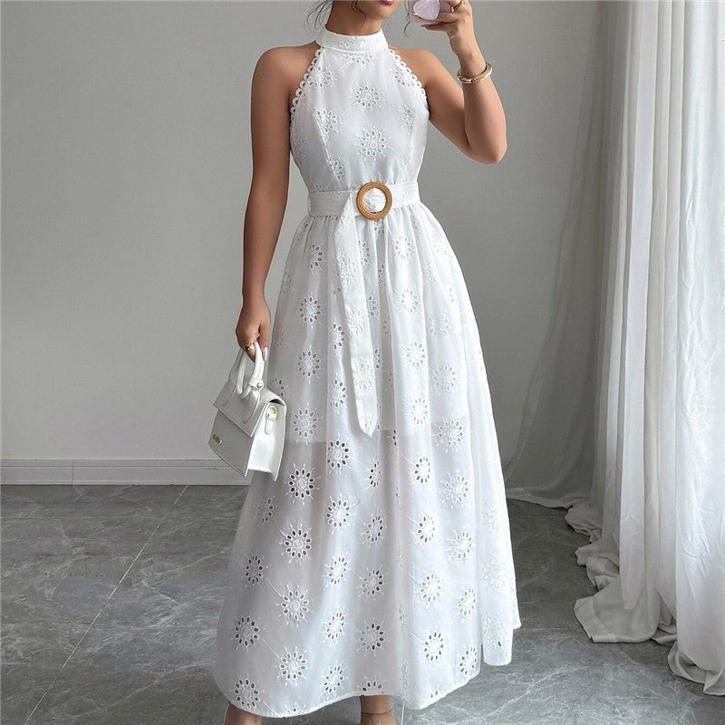 Material:DacronStyle:Cute,Intellectual,All-match,Look-youngerFeature:Tied,LaceNeckline:HalterneckOccasion:Going out,Casual,Vacation,Beach,Artistic Retro,Girlish Sweetness,Light Maturity,Leisure FashionSeasons:SummerType:Long DressesSleeve Length:SleevelessSize S (inch) : Bust= 35.88 ; Waist=...