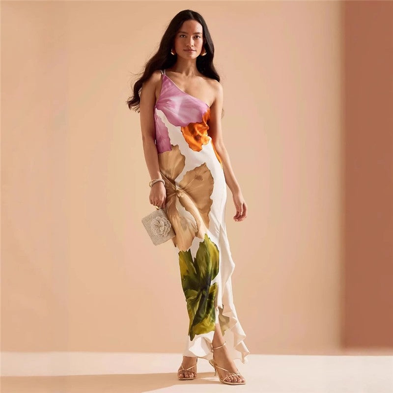 Material:DacronStyle:Intellectual,All-match,Look-youngerFeature:Printing,FalbalaNeckline:One-shoulderOccasion:Going out,Casual,Vacation,Beach,Artistic Retro,Girlish Sweetness,Light Maturity,Leisure FashionSeasons:SummerType:Maxi DressesSleeve Length:SleevelessSize S (inch) : Bust= 29.64 ; Waist=...