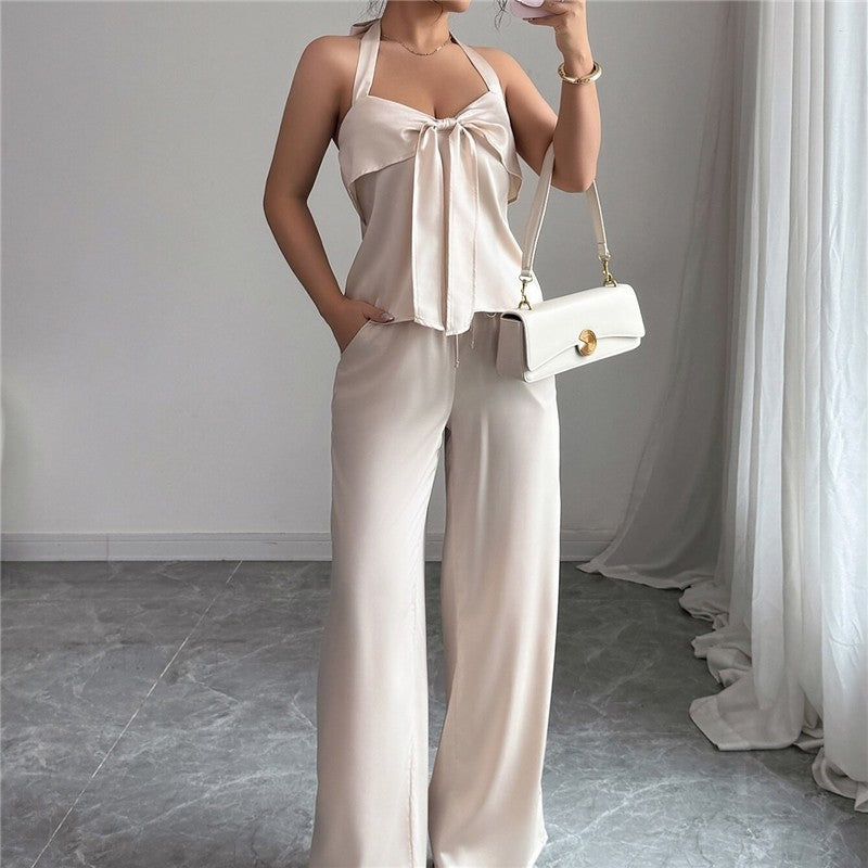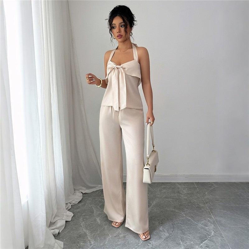 Solid Bow Neck Halter Wide Leg Pants Set