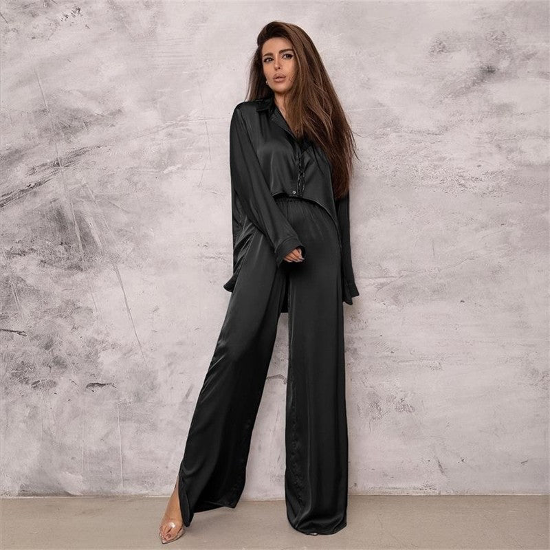 Long Sleeve Satin Two-Piece Pajama Set with Lapel Collar and Single-Breasted Blouse