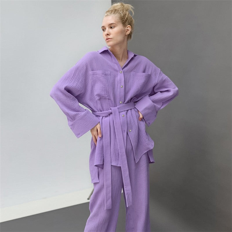 Solid Color Loose Long Sleeve Lapel Buttoned Waist Tie Blouse and Pants Set for Cozy Homewear