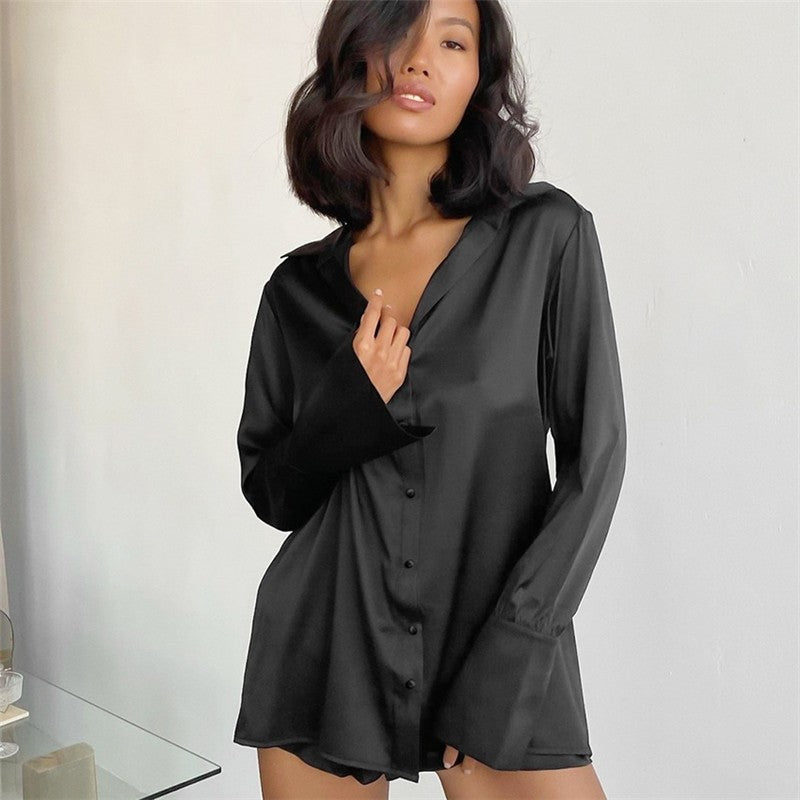 Solid Color Satin Long Sleeve Lapel Single Breasted Blouse and Shorts Two-Piece Pajama Set