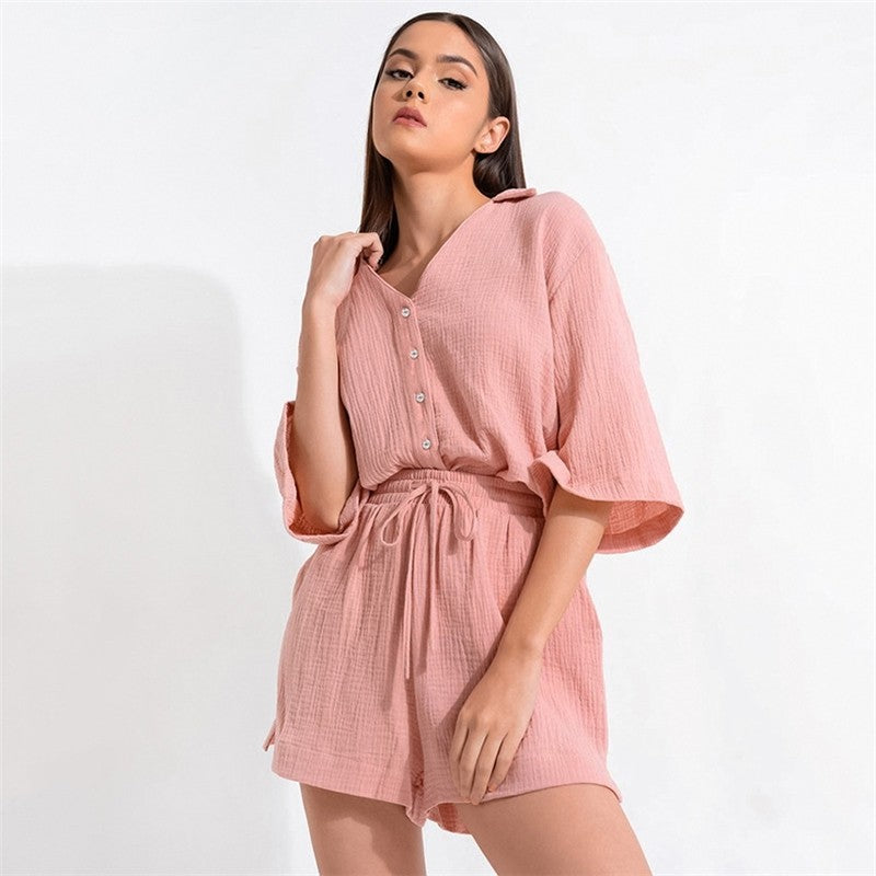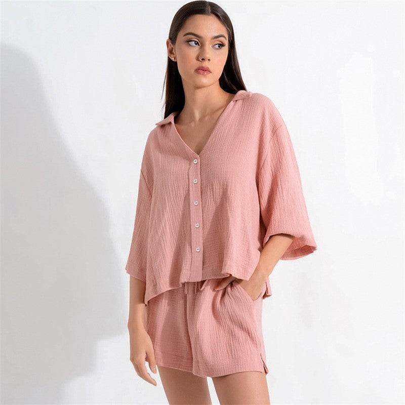 Solid Color V-Neck Loose-Fit Half-Sleeve Pajama Set with Blouse and Shorts