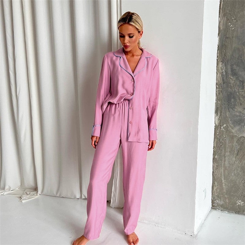 Imitated Silk Long Sleeve Buttoned Blouse and Pants Set - Solid Color Homewear Pajamas