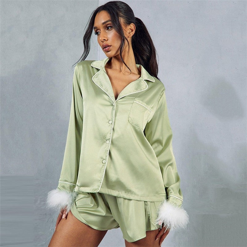 Feather Patchwork Long Sleeve Lapel Single Breasted Blouse and Shorts Two-Piece Pajama Set