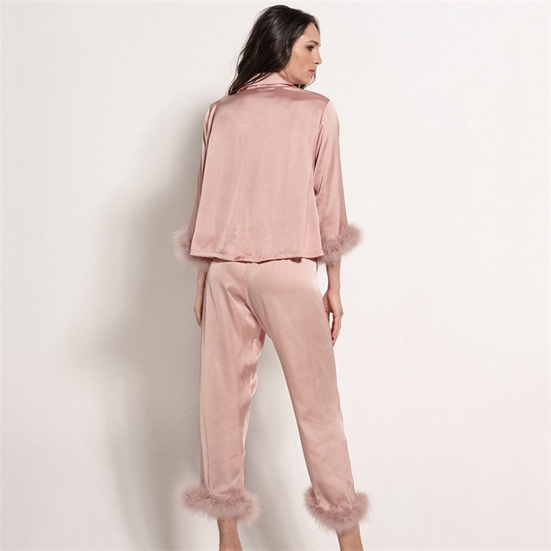 Feather Patchwork Two-Piece Suit: Long Sleeve Buttoned Blouse and Ninth Pants Homewear Pajama Set