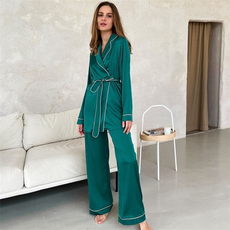 Loose Long Sleeve Lapel Buttoned Blouse with Waist Tie and Pants Set - Casual Homewear Pajamas