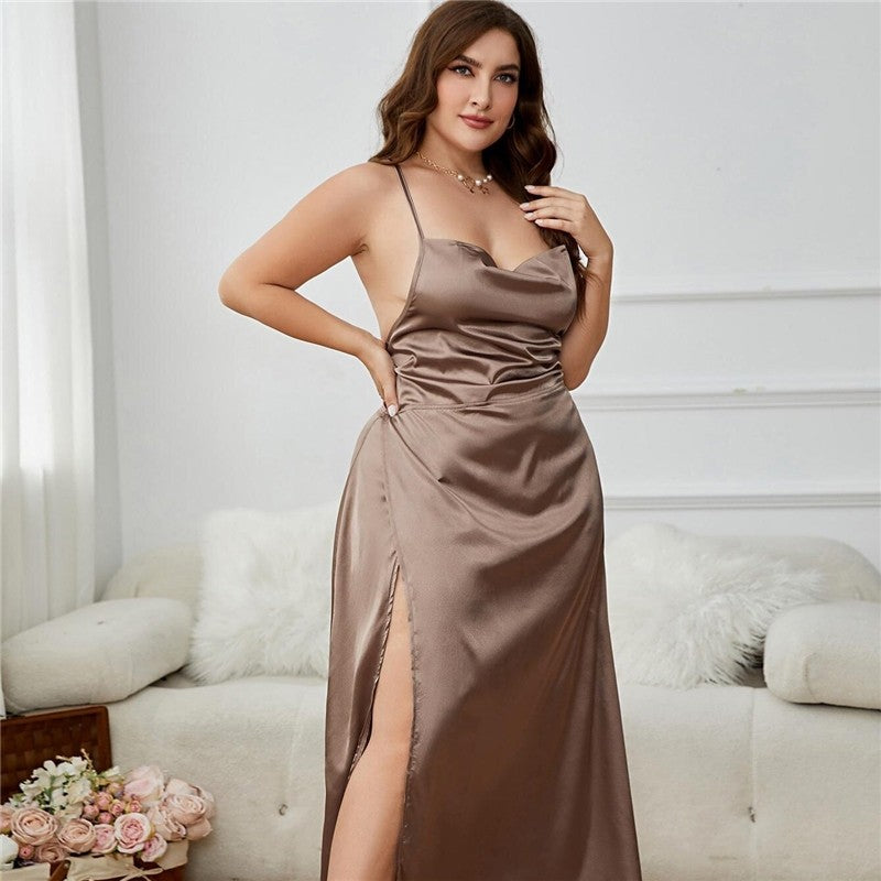 Material:DacronStyle:Loose,Look-younger,LitheFeature:Frenum,Thin,Plain,Backless,Split-sideNeckline:Spaghetti-NeckOccasion:Home WearSeasons:SummerType:Pajama DressSize XL (inch) : Bust = 42.12-46.02 ; Waist = 35.88-42.12 ; Hips=...