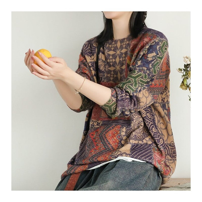Style:Loose,Intellectual,All-matchFeature:PrintingNeckline:Round-neckOccasion:Going out,Casual,Vintage,Artistic Retro,Light Maturity,Leisure FashionSeasons:Spring,Autumn,WinterType:SweaterSleeve Length:Long SleeveSleeve Style:Raglan SleeveSize One_size (inch) : Bust= 53.43 ;...