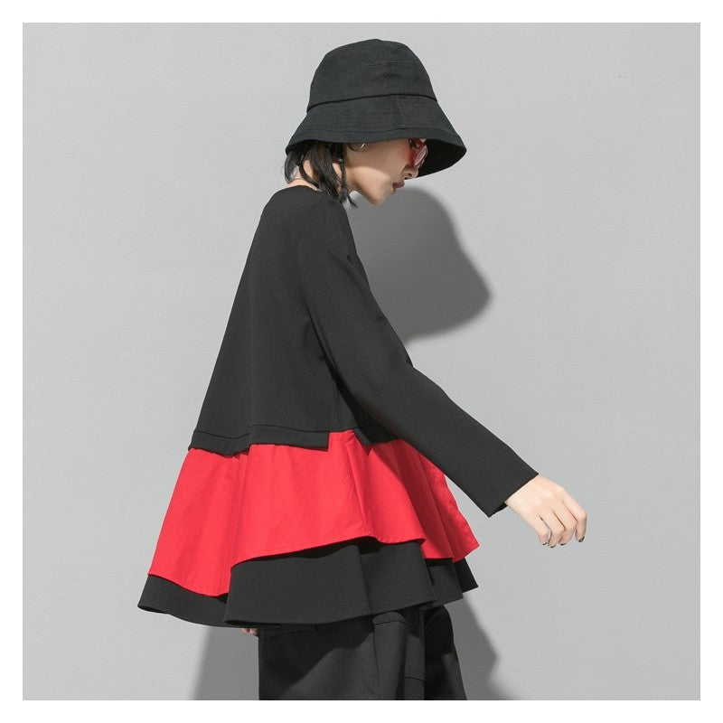 Loose Fit Ruffle Trim Patchwork Long Sleeve T-Shirt