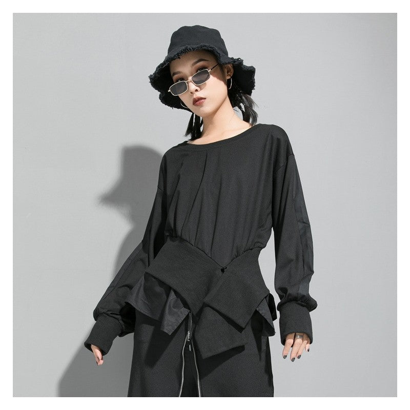 Splicing Ribbon Decoration Irregular Loose Long Sleeved T-Shirt