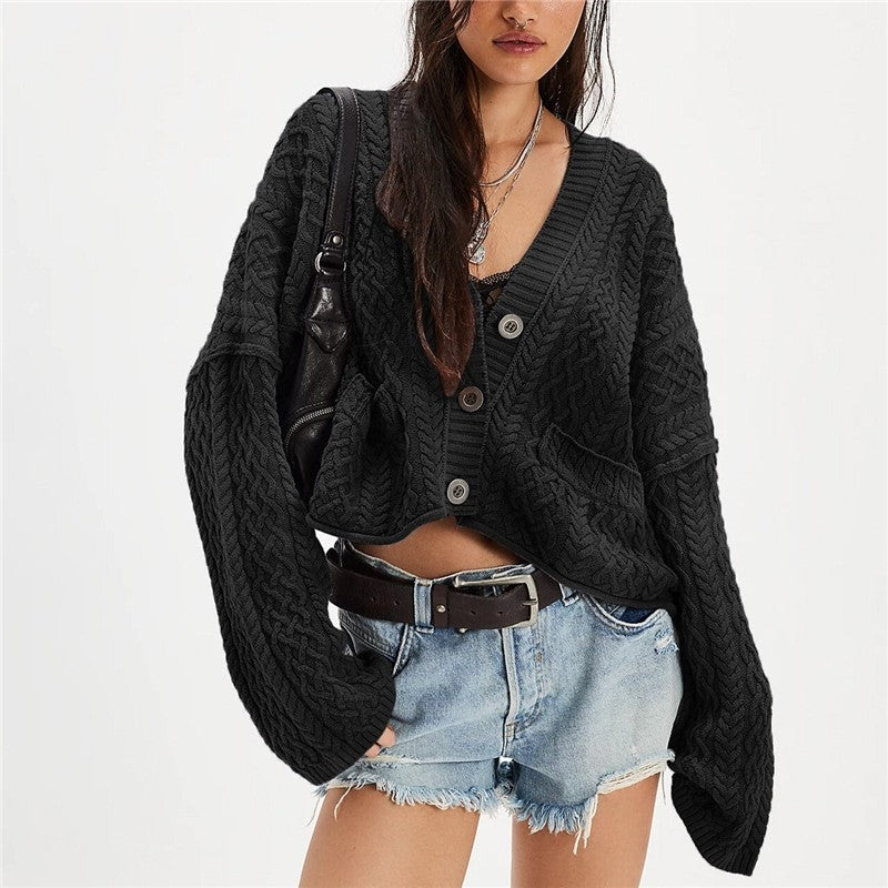 Solid Color Lantern Sleeve V Neck Loose Knit Cardigan