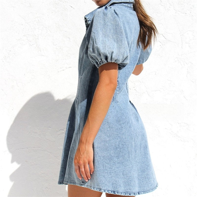 Bubble Sleeve Denim Mini Dress With Lapel