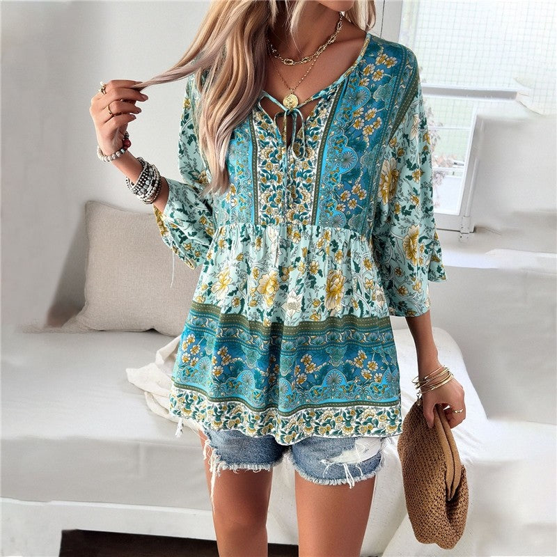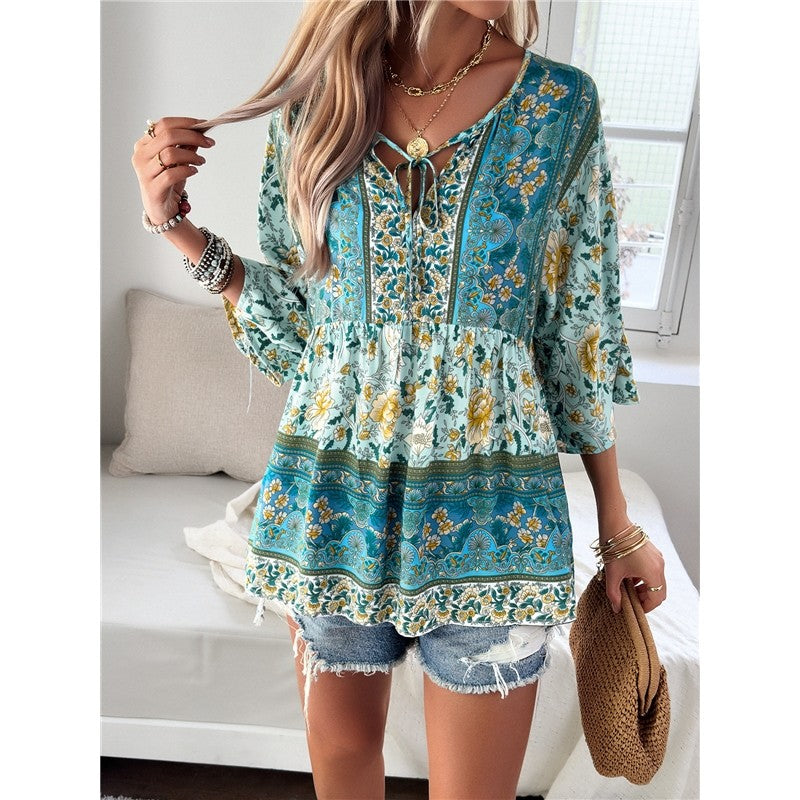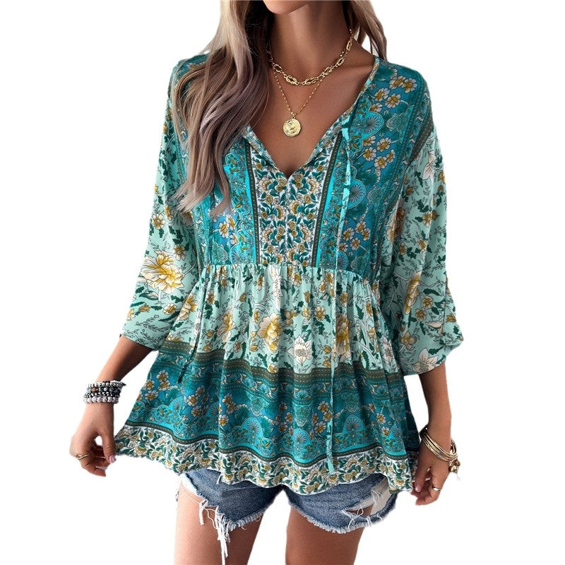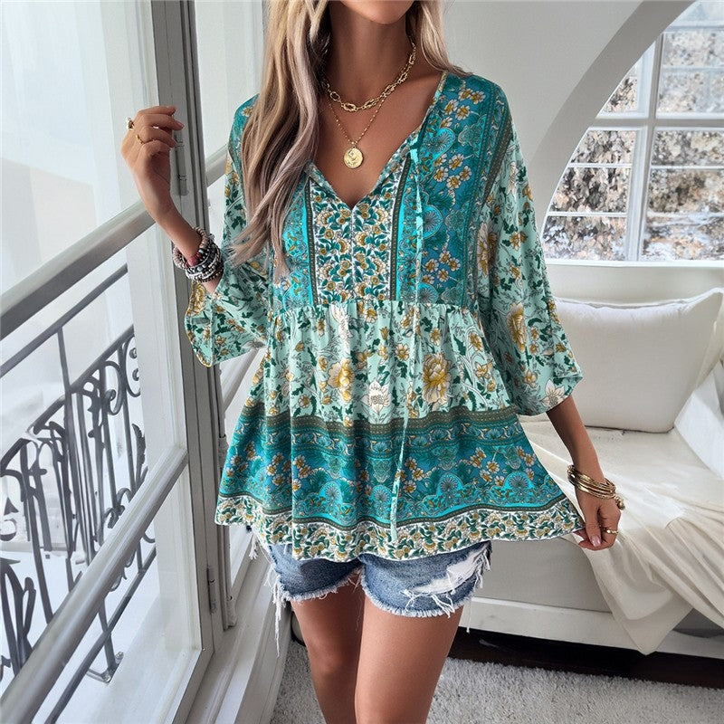 Casual Loose Printed V-Neck Blouse with Half Sleeves