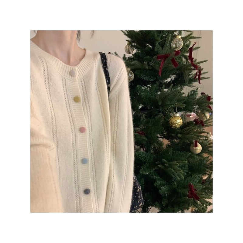 Hollow Out Color Button Round Neck Cardigan Sweater