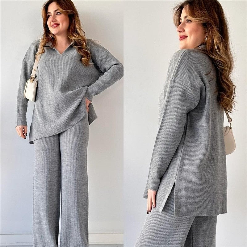 Knit Sweater And Long Pants Set With Solid Color And Split Hem