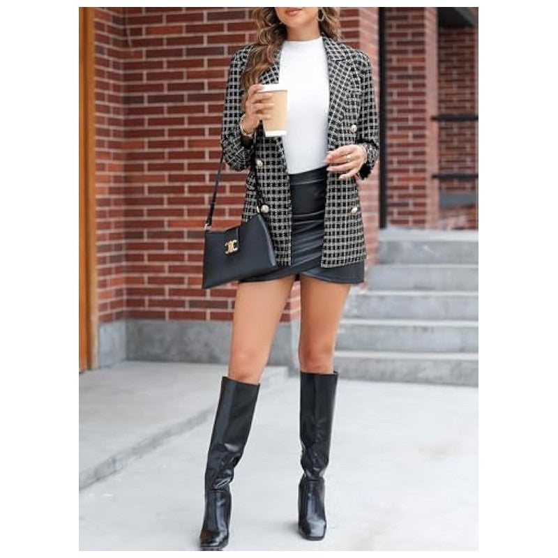 Long Sleeve Lapel Double Breasted Plaid Blazer Outerwear