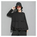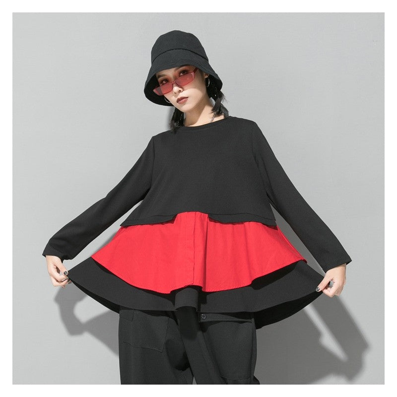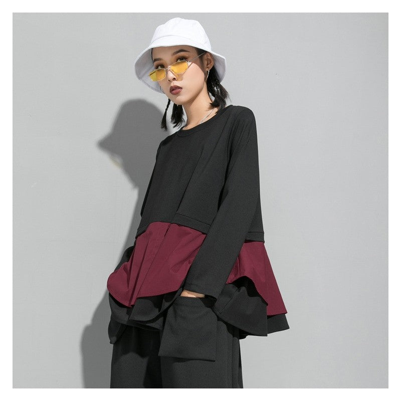 Loose Fit Ruffle Trim Patchwork Long Sleeve T-Shirt
