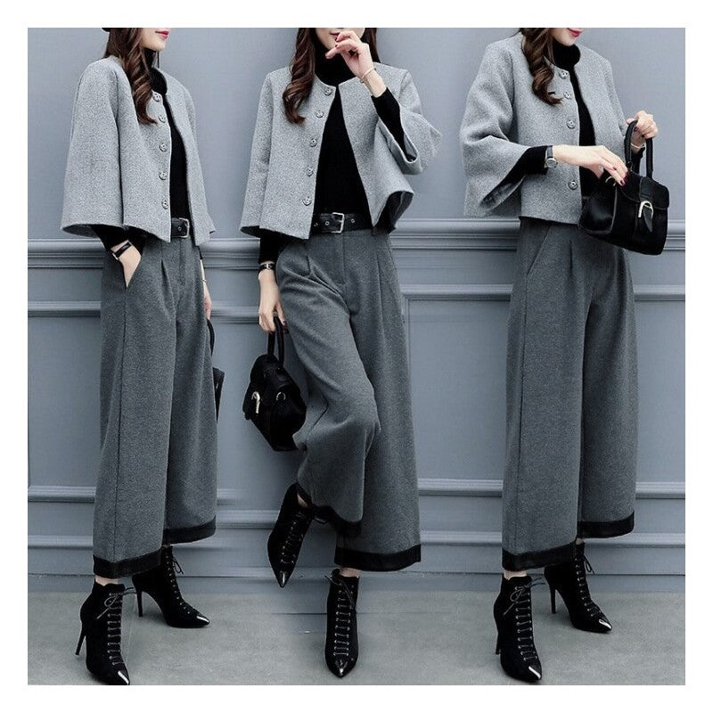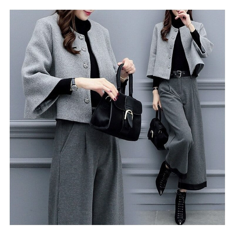 Short Woolen Jacket Wide-Leg Pants Suit