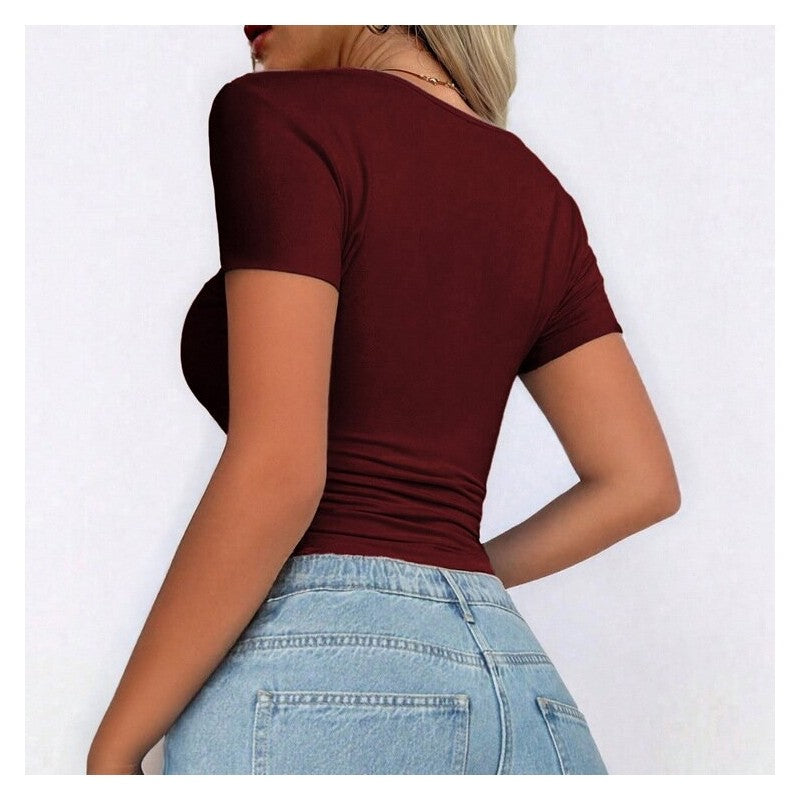 Add a touch of style to your wardrobe with our Solid Color U-Neck Slim Fit Crop Top T-Shirt. This trendy top features a flattering slim fit and a chic U-neck design, perfect for pairing with high-waisted jeans or skirts. Made from high-quality materials, this crop top is